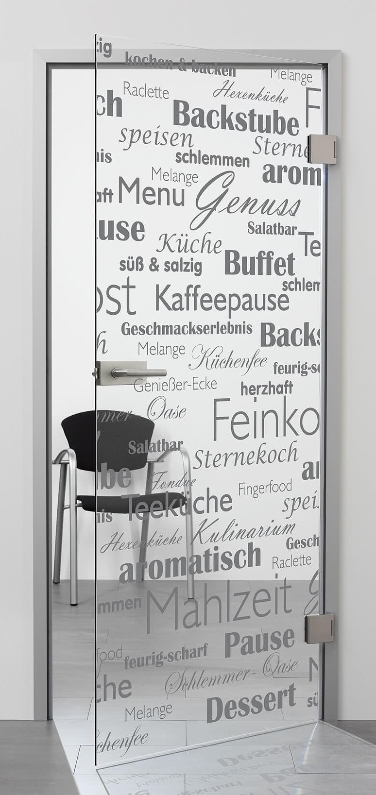 Siebdruck-Tür in Klarglas mit 1-farbigem Siebdruck, Schrift in eisengrau oder mit 2-farbigem Siebdruck, Schrift in eisengrau auf ganzflächigem Siebdruck mattweiß (Abb.).