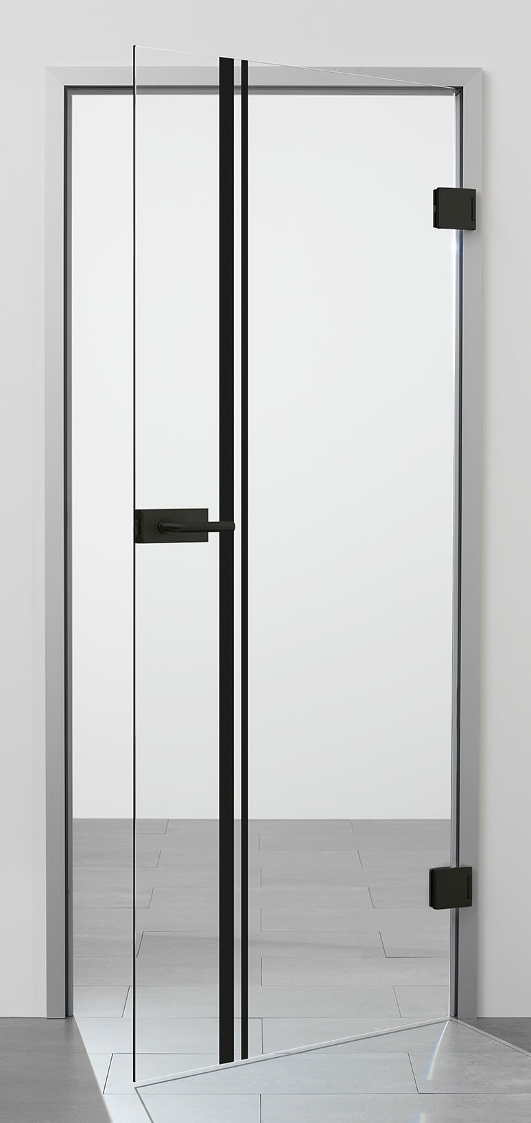Siebdruck-Tür in Klarglas mit 1-farbigem Siebdruck wahlweise in mattweiß oder milchweiß (2 senkrechte Streifen)..