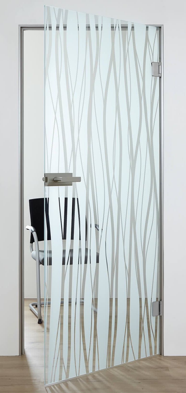Siebdruck-Tür in Klarglas mit 1-farbigem Siebdruck wahlweise in mattweiß oder milchweiß oder in Weißglas mit 1-farbigem Siebdruck wahlweise in milchweiß oder diamantweiß.