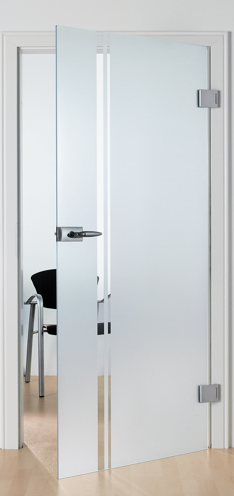 Siebdruck-Tür in Klarglas mit 1-farbigem Siebdruck wahlweise in mattweiß oder milchweiß oder in Weißglas mit 1-farbigem Siebdruck wahlweise in milchweiß oder diamantweiß mit 2 durchgehenden, klaren Linien.